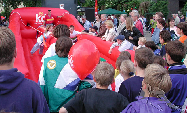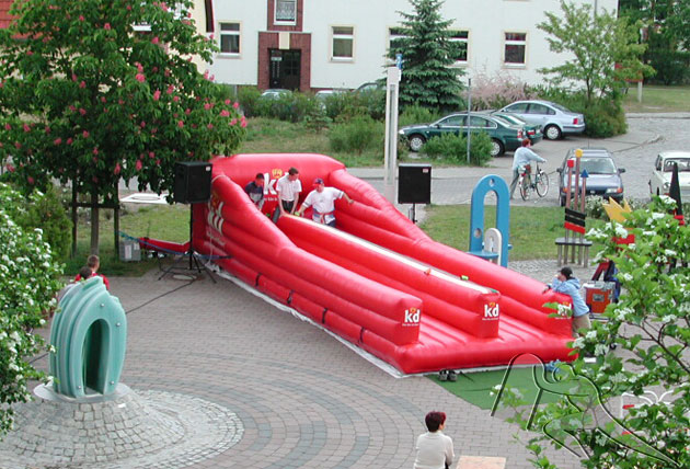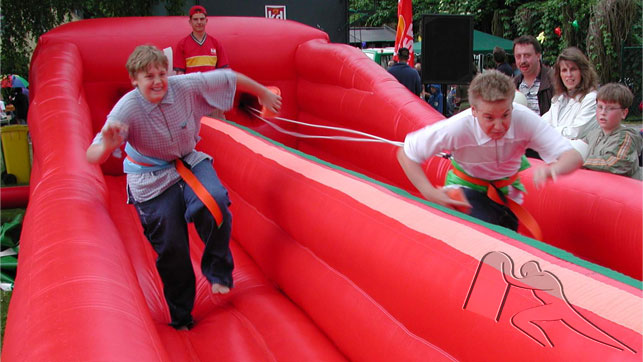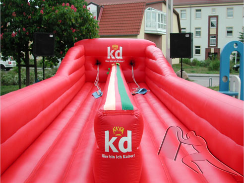 An ein Bungee - Seil gekettet, laufen die Kandidaten auf einer ca. 10 Meter langen, aufgeblasenen Bahn gegen die Kraft des Gummis. Ziel ist es, den Klettstab so weit wie möglich nach vorn zu bringen, bevor Sie das Seil zurückkatapultiert und Sie weich in der Luftkissenwand landen. Der Moderator der Show treibt nicht nur die Kandidaten zu Höchstleistungen an, sonder unterhält ebenso die umstehenden Zuschauer und animiert diese zum Mitmachen. Verschiedene Schwierigkeitsstufen ermöglichen spannenden Duelle wie zum Beispiel Vater gegen Sohn. Somit ist das Bungee Run ebenso ein Spass für die Kleinen. Das Bungee Run mieten - das irre Vergnügen für alle Altersgruppen!