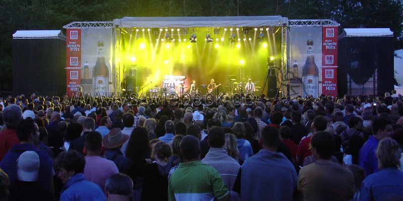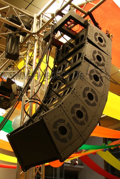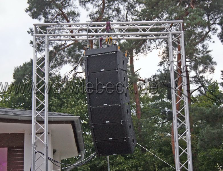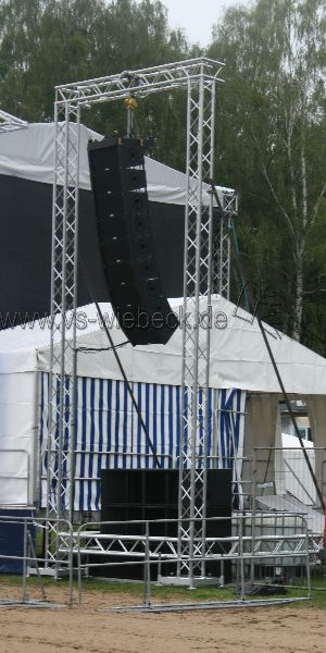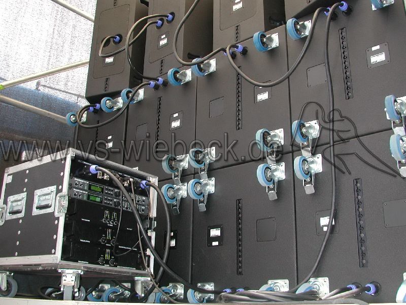 Boxen Front: 10x "EAW LA 400", 12x "EAW KF 730", Monitorsytem: max 4 Wege, 4x "EAW LA 215", Amping: 4x "LAB fp 10.000Q" (40kW), 2x "LAB 2002", Mixer: "Yamaha M7CL", Multicore 40/8 80m mit Stagebox "Connex", Equalizer / Prozessoren: 1x "LAB NLB 60E", 1x "EAW UX8800", 3x Equalizer "LA Audio EQ231 GSP", 1x "DATEQ SPL 3", Multieffektgeräte: 1x Multieffekt Processor "Yamaha SPX 990", 2x "dbx 166 XL Compressor / Limiter / Gate in Stereo, 1x "Drawmer MX40", 4-fach Punchgate, 2x Dual Feedback Exterminator "Sabine FBX 2020plus", Mikrophone: max. 4 Funkmikrophon UHF "Shure U2" mit Beta 87 Kapsel, 12x Kabelmikrophon "SM 57 / SM 58" + 1x Drumset "Shure Beta", 2x Richtmikrophon "Rode NT 5", 2x Großmembranmikrophon "t-bone SC-450" + Stative, Zusatzgeräte: CD- / MD- / DAT- Abspielmöglichkeit, 8x aktive DI-Boxen "Audiotec", incl.: Kabelsatz, Auf- und Abbau, max. 6 Stunden Einsatzzeit, 3x techn. Betreuungspersonal